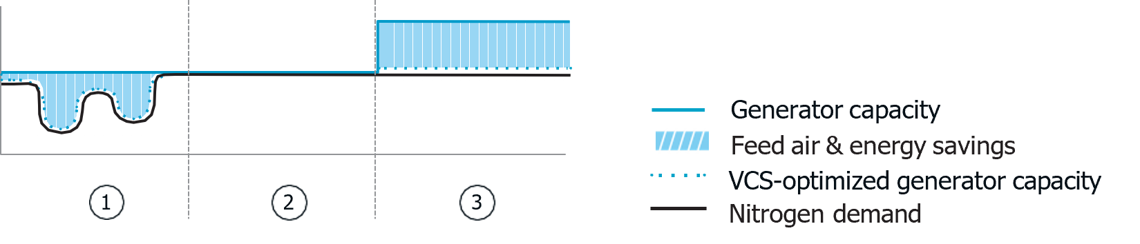 1. Low load: When there is less demand for nitrogen, VCS optimizes the PSA cycle to reduce the generator capacity and thus the feed air consumption to what is needed to generate the lower volume.