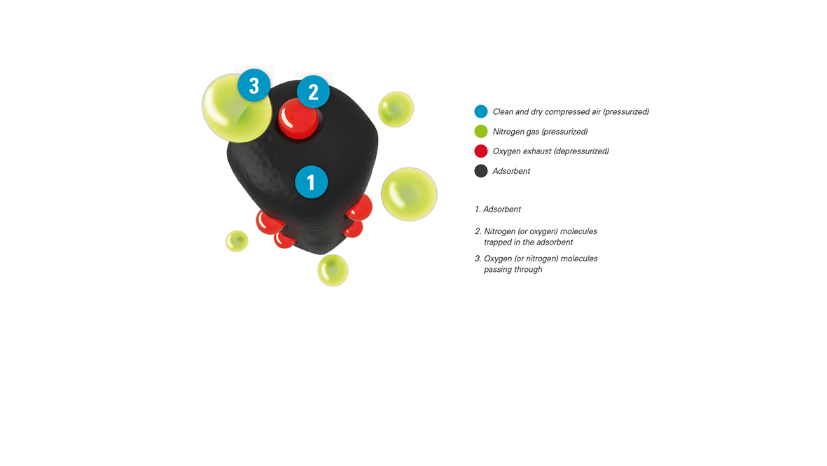 Atlas Copco’s NGP/NGP+ nitrogen generators use Pressure Swing Adsorption technology to isolate nitrogen molecules from other molecules in compressed air. Oxygen, CO2, water vapor and other gases are adsorbed. The result is virtually pure nitrogen at the outlet of the generator. The NGP/NGP+
